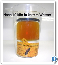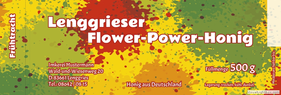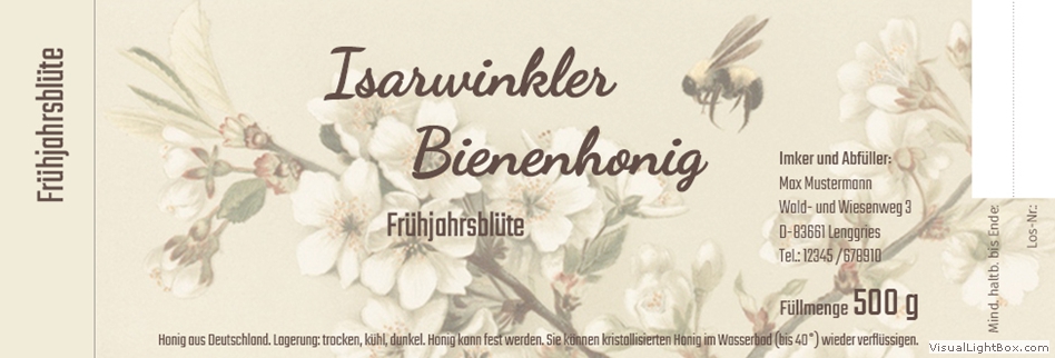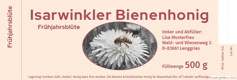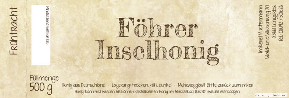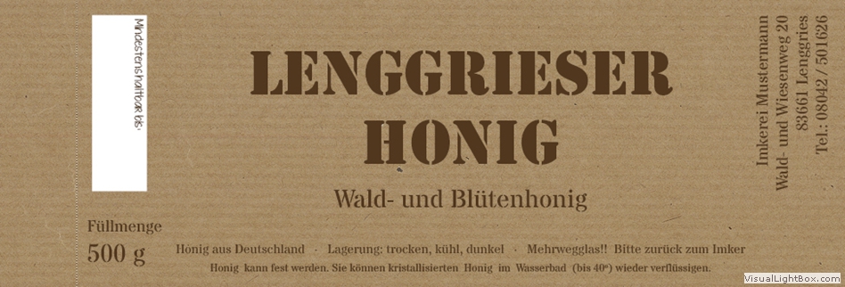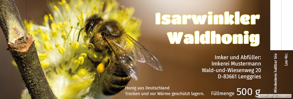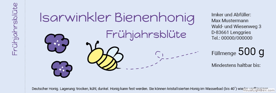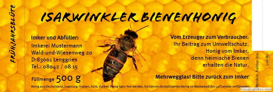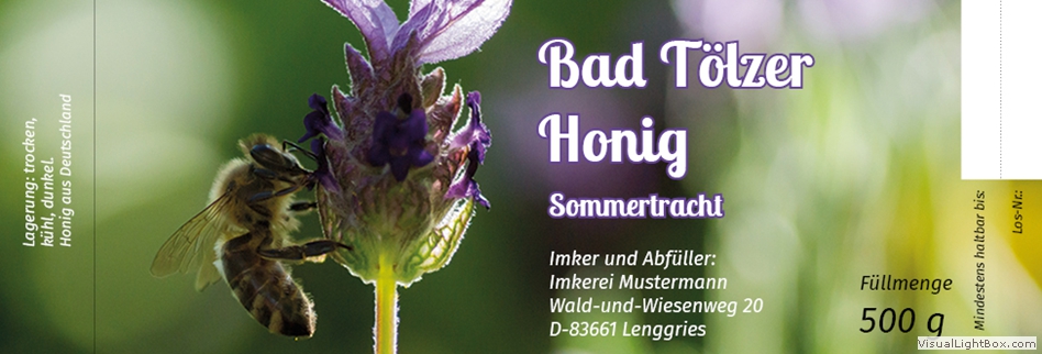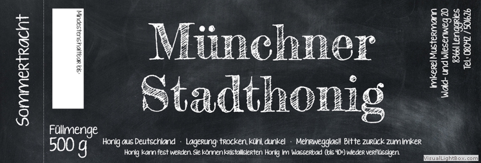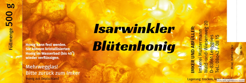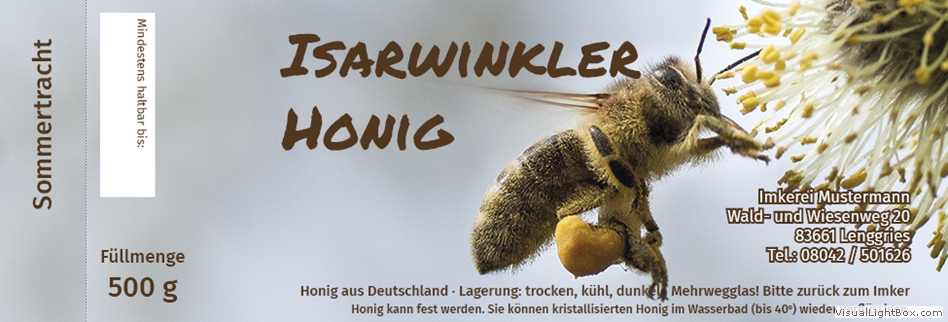 Selbstklebende Etiketten, die mit Wasser rückstandsfrei zu entfernen sind! Die bisherigen selbstklebenden Etiketten waren zwar schon praktischer als Nassklebeetiketten, aber sie waren sehr schlecht wieder zu entfernen. Speziell der Kleber konnte auch mit Alkohol oder Aceton sehr schlecht abgelöst werden. Wir bieten Ihnen nun ein Material an, dessen Kleber sich ganz einfach mit Wasser ablösen lässt. Die Etiketten werden professionell im Digitaldruck gefertigt und mit Ihren individuellen Daten, wie Adresse, Honigbezeichnung, ect., bedruckt. Die Auflagen können auch halbiert (z.B. 200 Frühtracht und 200 Sommertracht) oder geviertelt (je 100 Wald-, Blüten-, Raps- und Sonnenblumenhonig bei 400 Stück Auflage z.B.) werden. Das Frontetikett hat ein Format von 15 x 5,6 cm, der Abziehstreifen links mit 1,5 x 5,6 cm kann mit zusätzlichen Informationen, wie Sortenbezeichnung oder Füllmenge, bedruckt werden und als Gewährstreifen über den Deckelrand geklebt werden. Das matte Klebepapier lässt sich beschreiben und stempeln und unterscheidet sich von Standard-Selbstklebepapier durch den speziellen Kleber, der sich problemlos mit Wasser ablösen lässt und keinerlei Rückstände hinterlässt. Die Gläser einfach ca. 10 - 20 Minuten in lauwarmes Wasser stellen und die Etiketten fallen von selbst ab. Ohne Kleberrückstände. Da wir selbst produzieren, können wir aber auch Ihr ganz persönliches Motiv in jeder gewünschten Form drucken und stanzen.