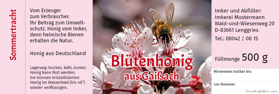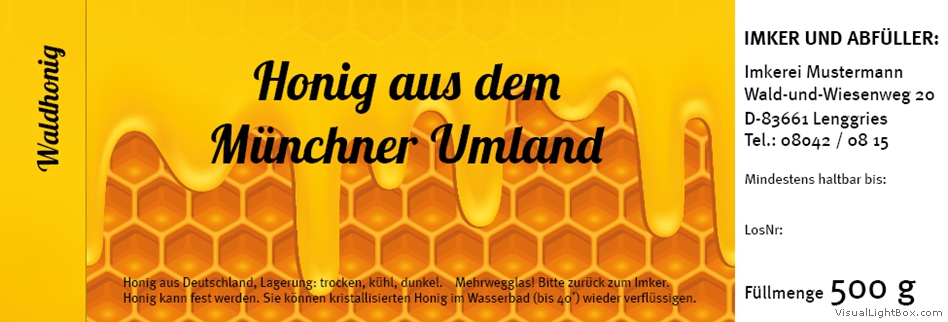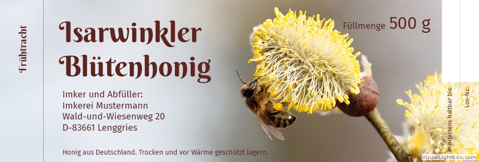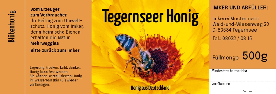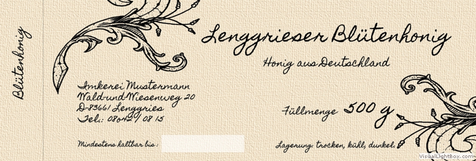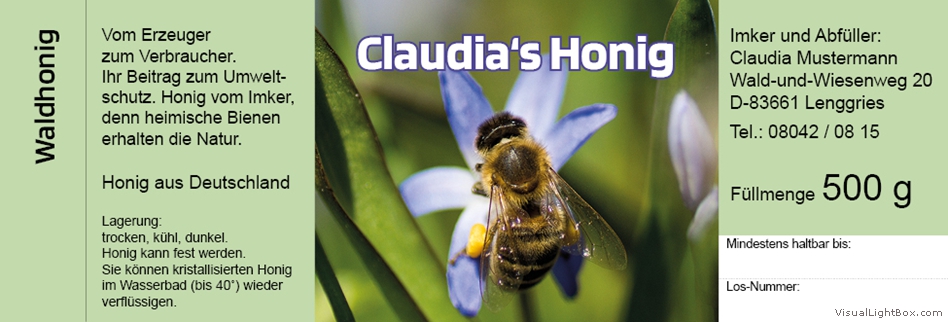 Bitte lassen Sie uns per e-mail das gewünschte Motiv, die gewünschte Auflage, Adresse mit Telefonnummer, Honigbezeichnung, evtl. Sortenbezeichnungen mit der gewünschten Stückelung (z.B. 1/2 Sommertracht, 1/4 Frühtracht, 1/4 Waldhonig) zukommen. Es würde mich freuen, wenn Ihnen die Etiketten gefallen und wir erwarten gerne Ihre Anfrage. Bernhard Nilles |